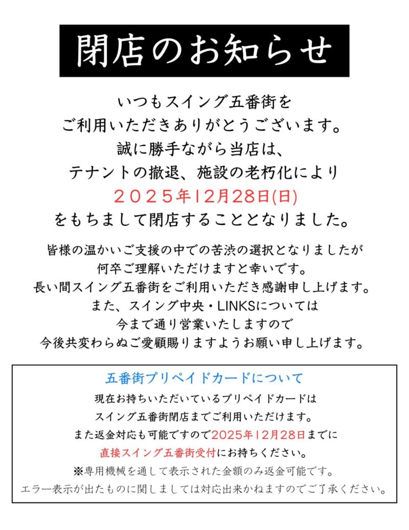 お知らせ&スタッフブログ NEWS&BLOGホーム お知らせ&スタッフブログ お知らせ 【スイング五番街】 閉店のお知らせ 2025.9.26【スイング五番街】 閉店のお知らせ#お知らせ スイングアカデミー宮城※更新特典のプリペイドカードは返金の対象外となりますのでご了承ください。前へ次へ一覧へ戻る同じスタッフが書いた記事はこちら 2025.10.1 2025年 11月 スイング中央 レッスン担当 #お知らせ 2025.9.26 【スイング五番街】 閉店のお知らせ #お知らせ 2025.9.1 2025年 10月 スイング中央 レッスン担当 #お知らせREAD MORE同じテーマの記事はこちら 2025.7.26 2025年後半 ラウンドレッスン(18H)・練習会(9H)のご案内 #お知らせ 2024.3.1 2024年 4月 スイング中央 レッスン担当 #お知らせ 2024.12.1 2025年 1月 スイング中央 レッスン担当 #お知らせREAD MORE