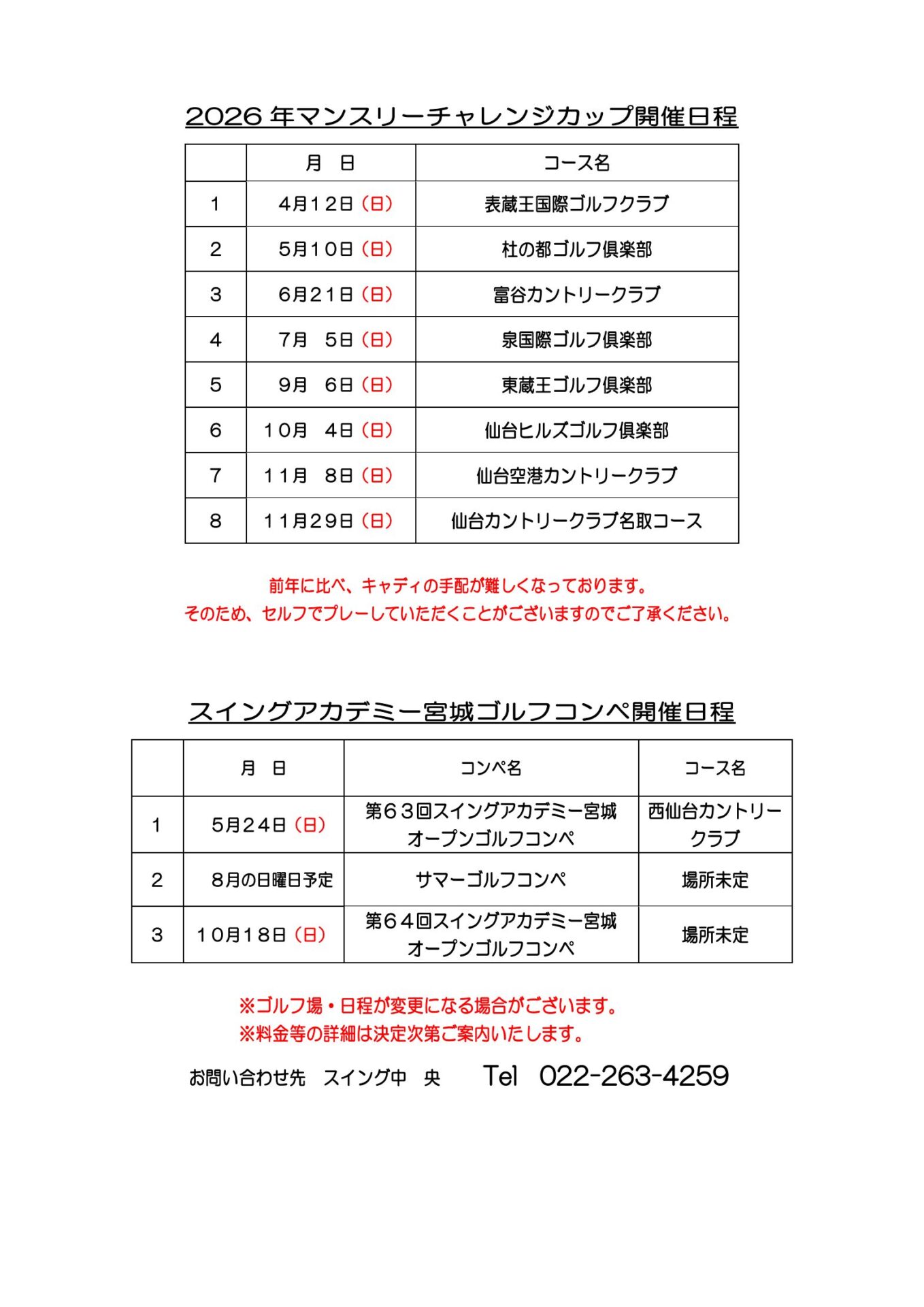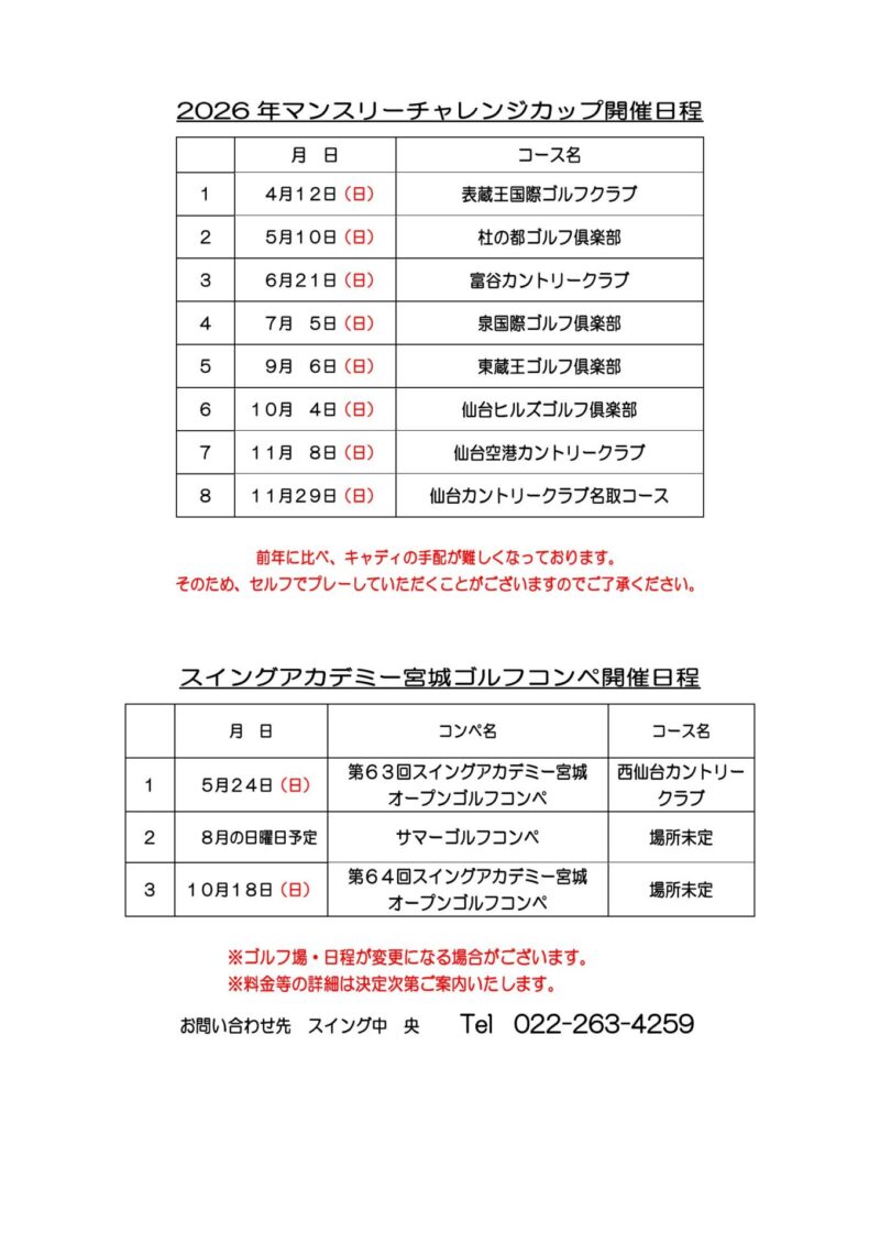 お知らせ&スタッフブログ NEWS&BLOGホーム お知らせ&スタッフブログ お知らせ 2026 年間イベントのお知らせ 2026.2.62026 年間イベントのお知らせ#お知らせ スイングアカデミー宮城今年の年間イベント開催日は以下の日にちで予定しております(・ω・)❗❗詳細・参加申込みの受付開始日については決まり次第改めてお伝えします💁♀️✨※やむを得ず日にち・場所の変更がある場合がございますので予めご了承ください。前へ 一覧へ戻る同じスタッフが書いた記事はこちら 2026.2.6 2026 年間イベントのお知らせ #お知らせ 2026.2.1 2026年 3月 スイング中央 レッスン担当 #お知らせ 2026.1.15 2026年 2月 スイング中央 レッスン担当 #お知らせREAD MORE同じテーマの記事はこちら 2025.9.26 【スイング五番街】 閉店のお知らせ #お知らせ 2023.10.11 ゴルフスクール開校のお知らせ⛳ #お知らせ 2024.3.1 2024年 4月 スイング中央 レッスン担当 #お知らせREAD MORE