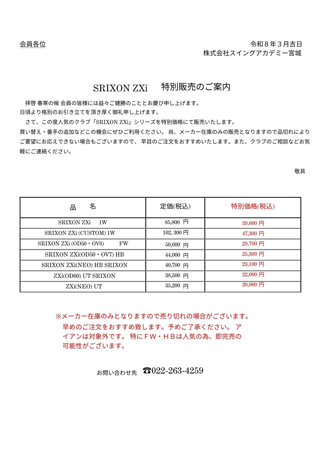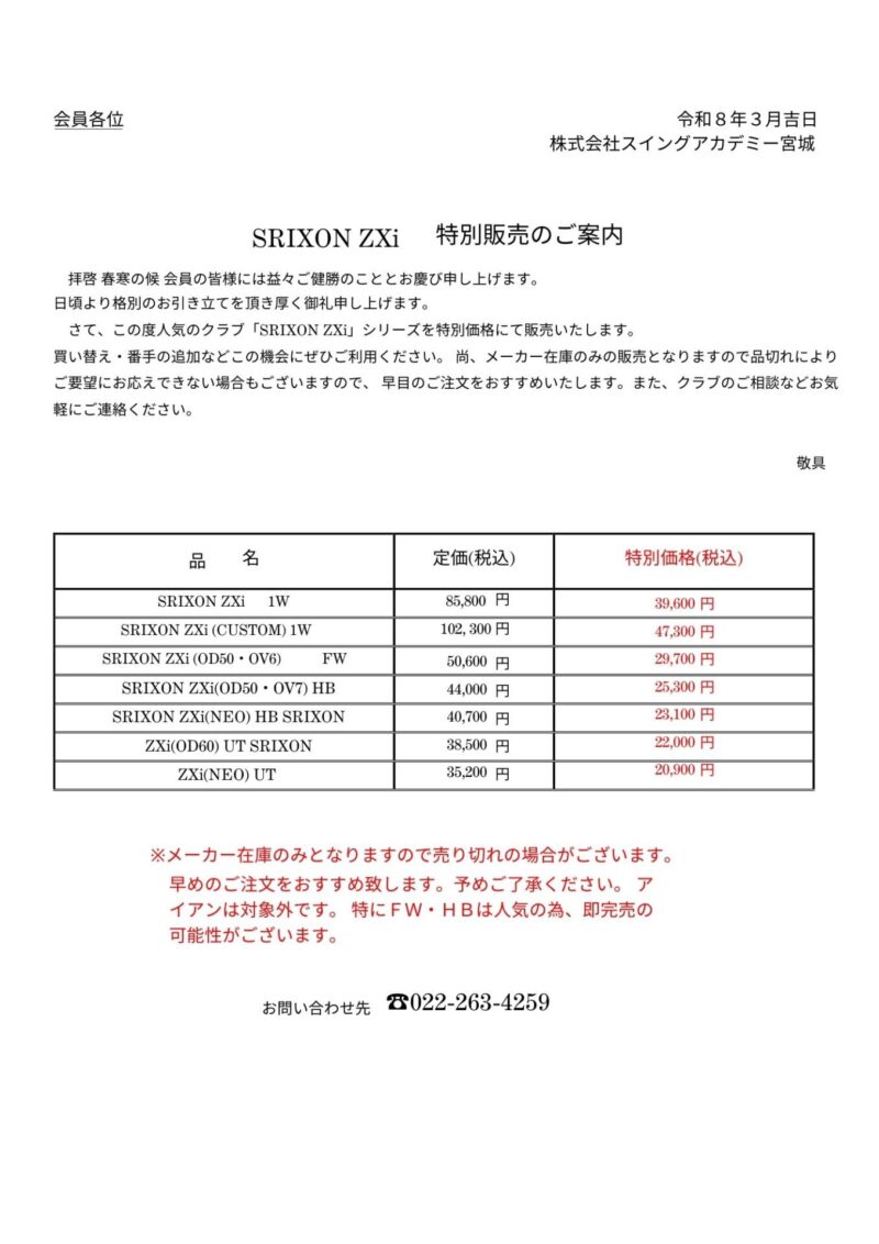 お知らせ&スタッフブログ NEWS&BLOGホーム お知らせ&スタッフブログ お知らせ SRIXON ZXi 特別販売のお知らせ 2026.3.7SRIXON ZXi 特別販売のお知らせ#お知らせ スイングアカデミー宮城前へ 一覧へ戻る同じスタッフが書いた記事はこちら 2026.3.7 SRIXON ZXi 特別販売のお知らせ #お知らせ 2026.3.7 2026年前半 ラウンドレッスン(18H)・練習会(9H)のご案内 #お知らせ 2026.3.1 2026年 4月 スイング中央 レッスン担当 #お知らせREAD MORE同じテーマの記事はこちら 2022.4.17 第55回 スイングアカデミー宮城杯ゴルフコンペのご案内 #お知らせ 2024.7.22 2024 夏の試打・販売会 #お知らせ 2025.7.26 2025年後半 ラウンドレッスン(18H)・練習会(9H)のご案内 #お知らせREAD MORE