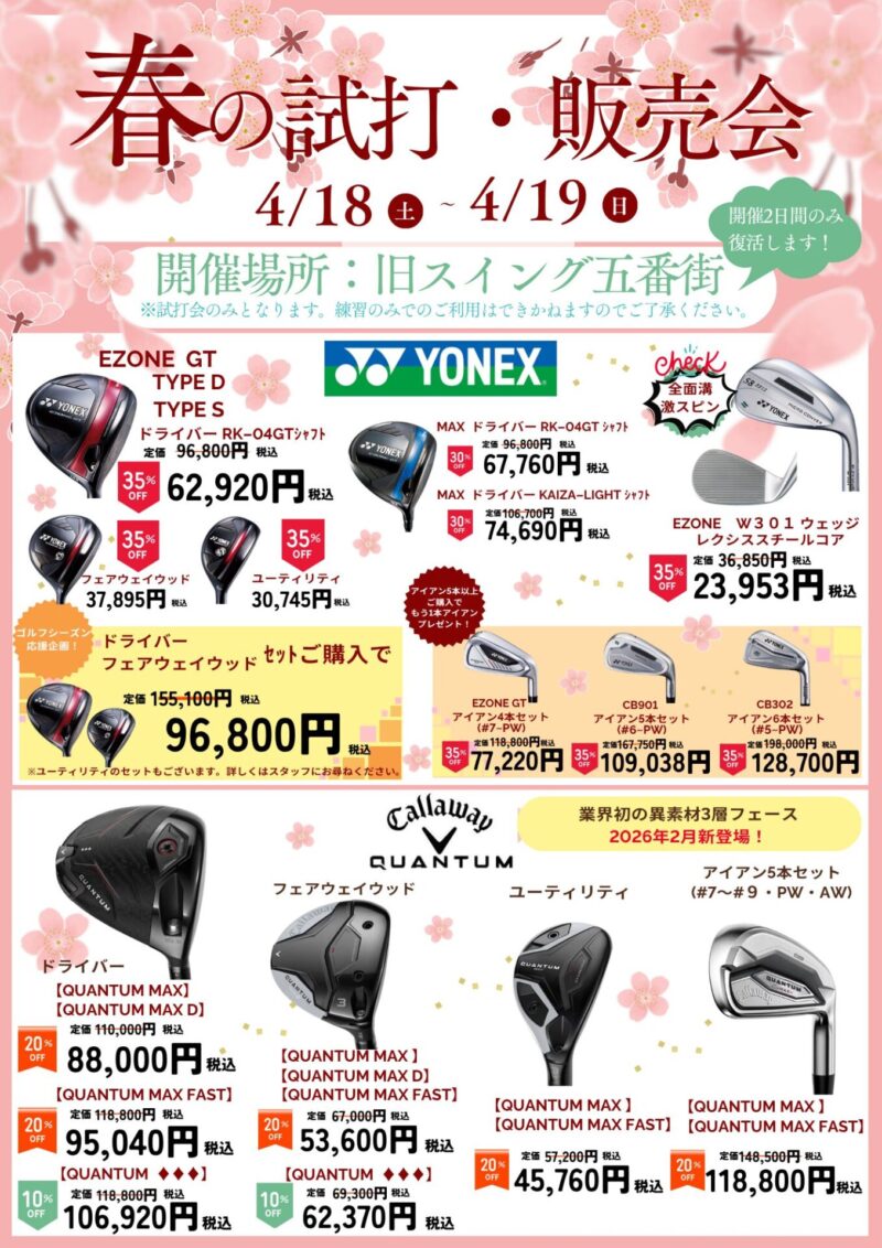 お知らせ&スタッフブログ NEWS&BLOGホーム お知らせ&スタッフブログ お知らせ 2026 春の試打・販売会 2026.4.62026 春の試打・販売会#お知らせ スイングアカデミー宮城前へ 一覧へ戻る同じスタッフが書いた記事はこちら 2026.4.6 2026 春の試打・販売会 #お知らせ 2026.4.1 2026年 5月 スイング中央 レッスン担当 #お知らせ 2026.3.7 SRIXON ZXi 特別販売のお知らせ #お知らせREAD MORE同じテーマの記事はこちら 2025.3.30 2025春の試打販売会 #お知らせ 2024.9.8 2024年 マンスリーチャレンジカップ 後半戦 #お知らせ 2025.2.1 2025年 3月 スイング中央 レッスン担当 #お知らせREAD MORE