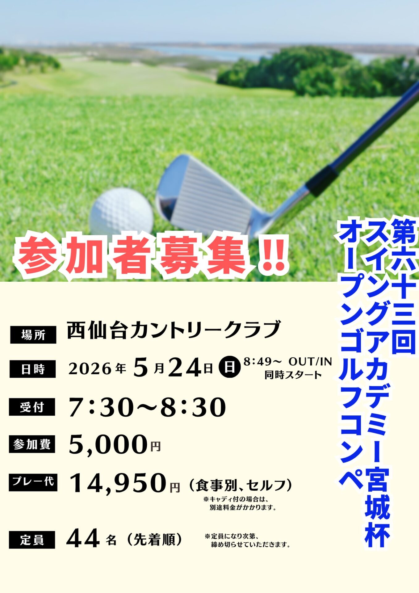 お知らせ&スタッフブログ NEWS&BLOGホーム お知らせ&スタッフブログ お知らせ 第63回 スイングアカデミー宮城杯オープンゴルフコンペ 2026.4.9第63回 スイングアカデミー宮城杯オープンゴルフコンペ#お知らせ スイングアカデミー宮城毎年恒例のスイングアカデミー宮城杯オープンコンペを開催します(´っ・ω・)っ!🍀グループ・おひとりさまのご参加大歓迎!🍀参加ご検討中の方はぜひお早めにお申込みください☺️✨お申込み・お問合せはスイング中央まで( ˘ω˘ )📞TEL 022-263-4259前へ 一覧へ戻る同じスタッフが書いた記事はこちら 2026.4.9 第63回 スイングアカデミー宮城杯オープンゴルフコンペ #お知らせ 2026.4.6 2026 春の試打・販売会 #お知らせ 2026.4.1 2026年 5月 スイング中央 レッスン担当 #お知らせREAD MORE同じテーマの記事はこちら 2025.5.1 2025年 6月 スイング中央 レッスン担当 #お知らせ 2023.10.11 ゴルフスクール開校のお知らせ⛳ #お知らせ 2025.2.1 2025年 3月 スイング中央 レッスン担当 #お知らせREAD MORE